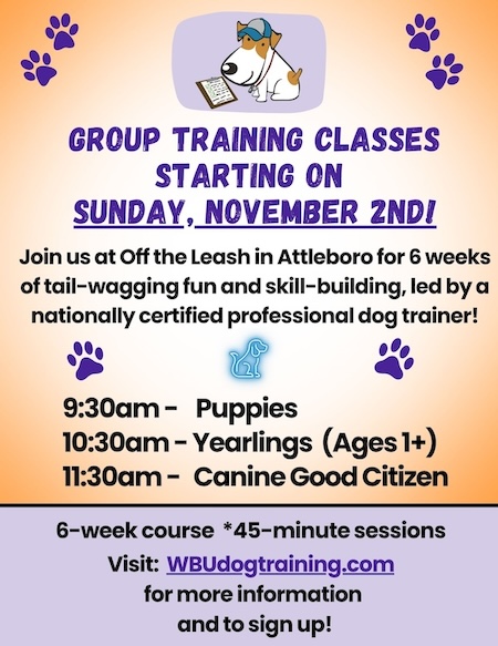 Off The Leash is proud to offer positive reinforcement classes. Group, private & in-home training options available!